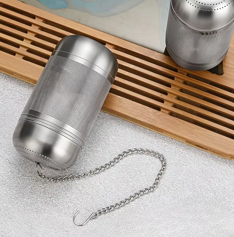 Stainless steel spice and tea infuser 4cm diameter x 8cm height. Ideal for infusing whole spices into any dish during the cooking process. Comes with 20cm chain and hook to suspend the canister from the side of the saucepan and twist top lid.
